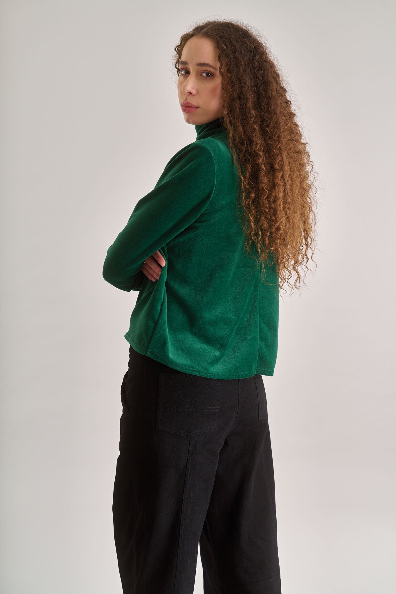 The ALICE Velvet Top in Emerald green combines the softness of organic cotton with the durability of recycled polyester for a sustainable, vegan-friendly choice. Its winter weight velvet offers cozy warmth, complemented by smocked cuffs and a delicate cut-out neck detail that add a touch of effortless style. Made in a Sedex-audited factory, this top supports ethical production while keeping you comfortable and chic through colder months.