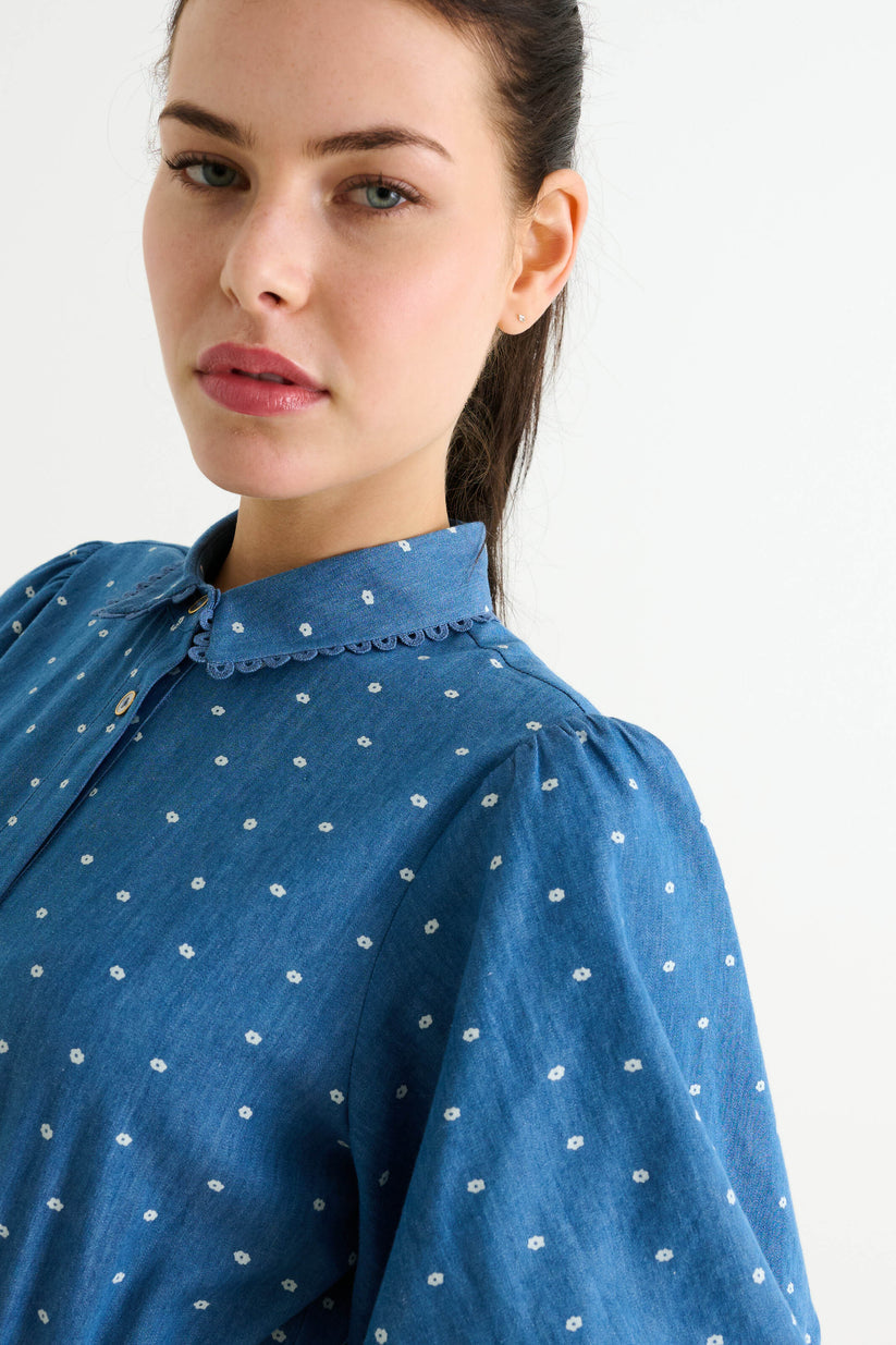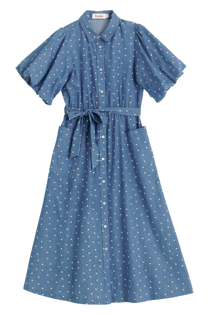 Meet Lola a medium blue chambray shirtdress scattered white flower-shaped dots. Features dramatic short balloon sleeves, an elasticated waist with tie for waist definition, and generous patch pockets—the practical touches that make getting dressed effortless. Flattering and functional, whether you're juggling a packed schedule or simply want a dress that works as hard as you do.