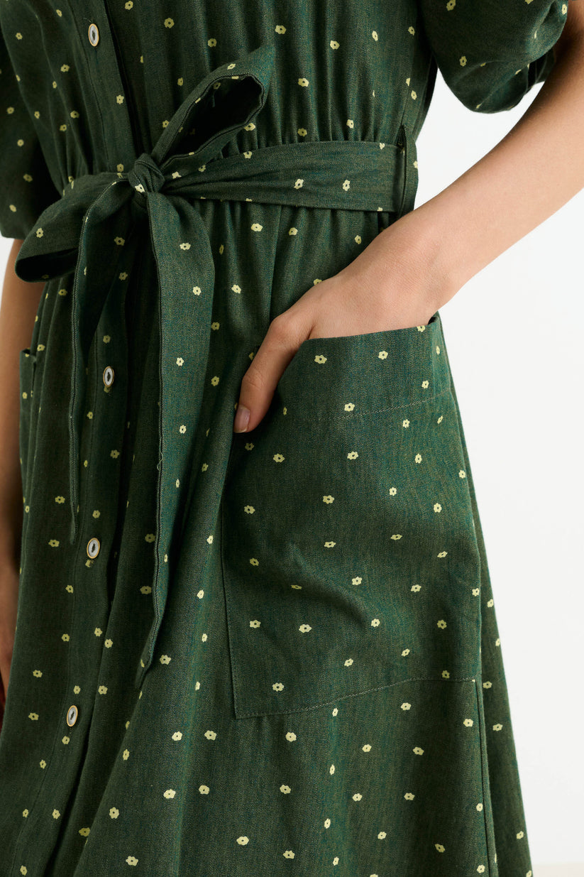 Meet Lola a fern green chambray shirtdress scattered white flower-shaped dots. Features dramatic short balloon sleeves, an elasticated waist with tie for waist definition, and generous patch pockets—the practical touches that make getting dressed effortless. Flattering and functional, whether you're juggling a packed schedule or simply want a dress that works as hard as you do.