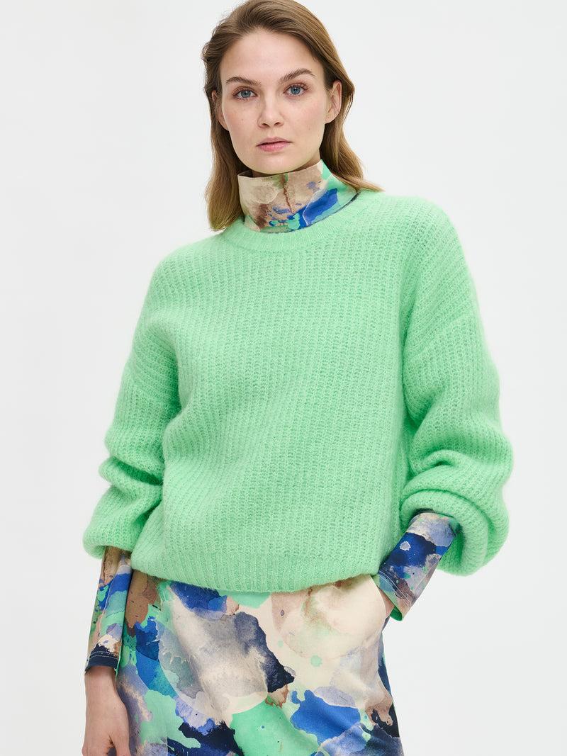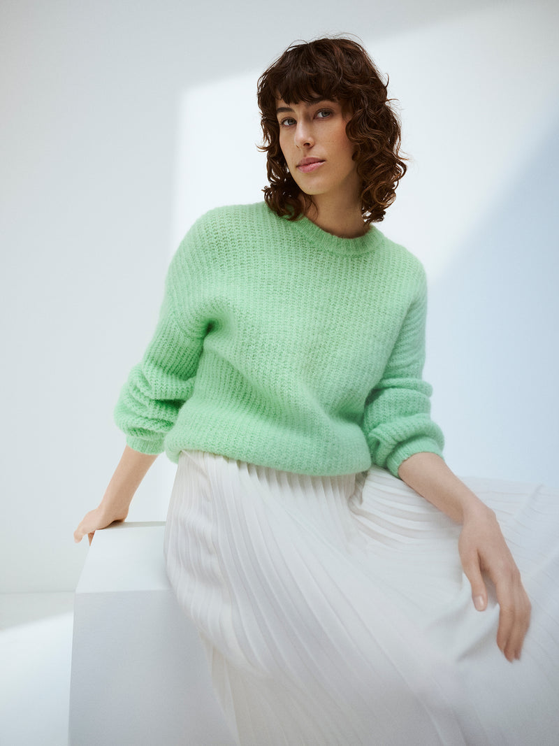 Karamelli tröja är en mjuk men ändå underbart lätt ljusgrön tröja som är enkel att matcha med vilken outfit som helst. Den stickade tröjan har rund halsringning och vida ärmar.