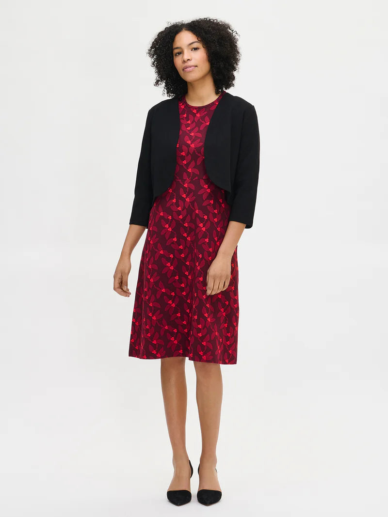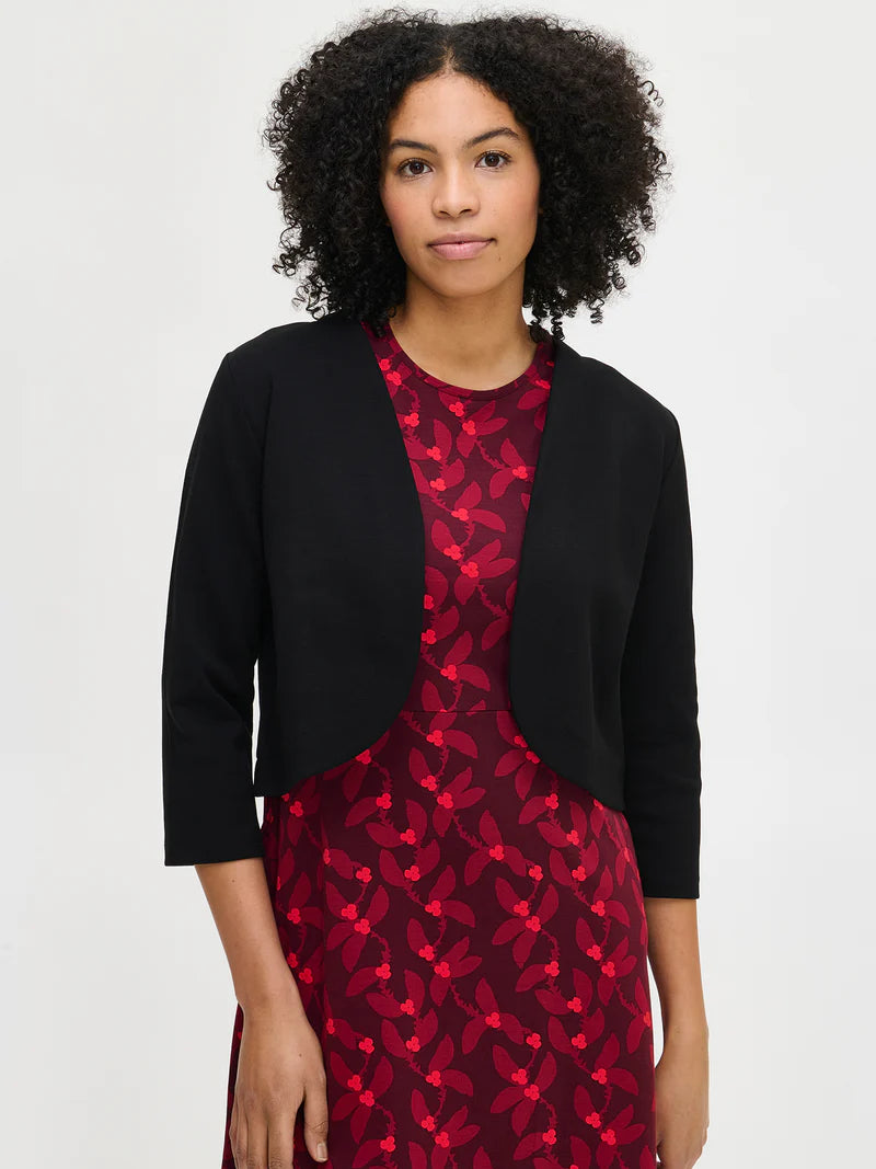 Denna eleganta bolero har en diskret fållkant vid halsringning och nederkant, där fållen är lätt rundad för en smickrande silhuett. Ärmarna är 3/4-långa, och längden på plagget är cirka 50 cm i storlek M. Tillverkad i en behaglig, något kraftigare interlockstickning som ger både komfort och struktur. En tidlös och användbar bolero som på ett stilfullt sätt fulländar din outfit – oavsett tillfälle.