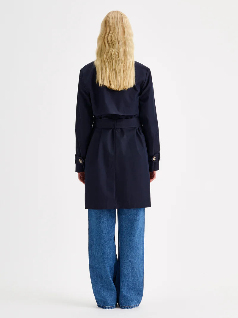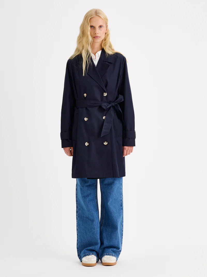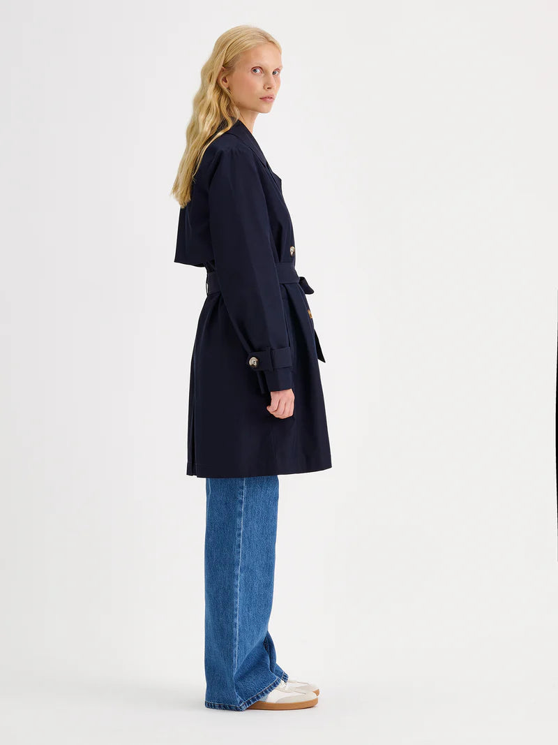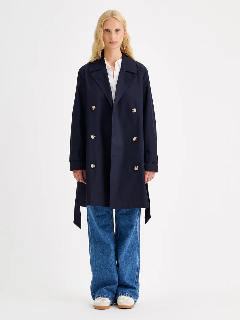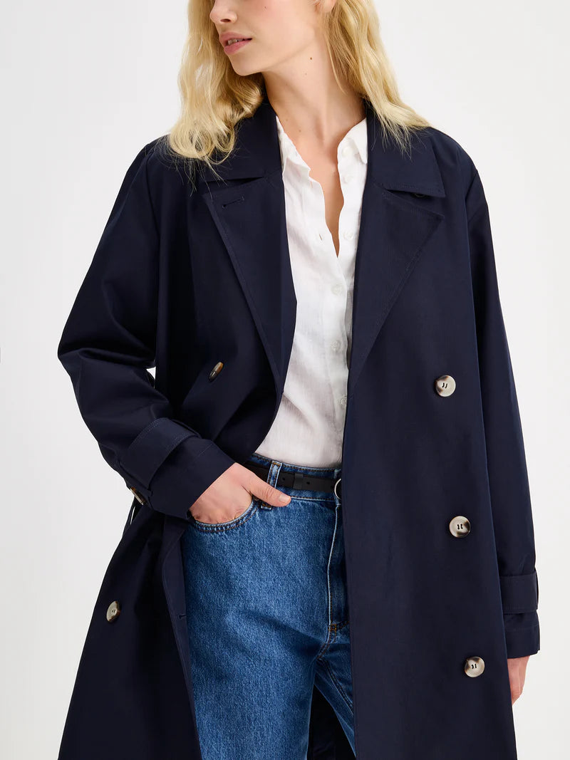 Midi-trenchcoat i en klassisk mörkblå nyans. Den midilånga trenchcoaten är en snygg och tidlös kappa som du kommer att återvända till år efter år. Kappan är lätt att matcha med jeans och klänningar och fungerar till alla tillfällen.