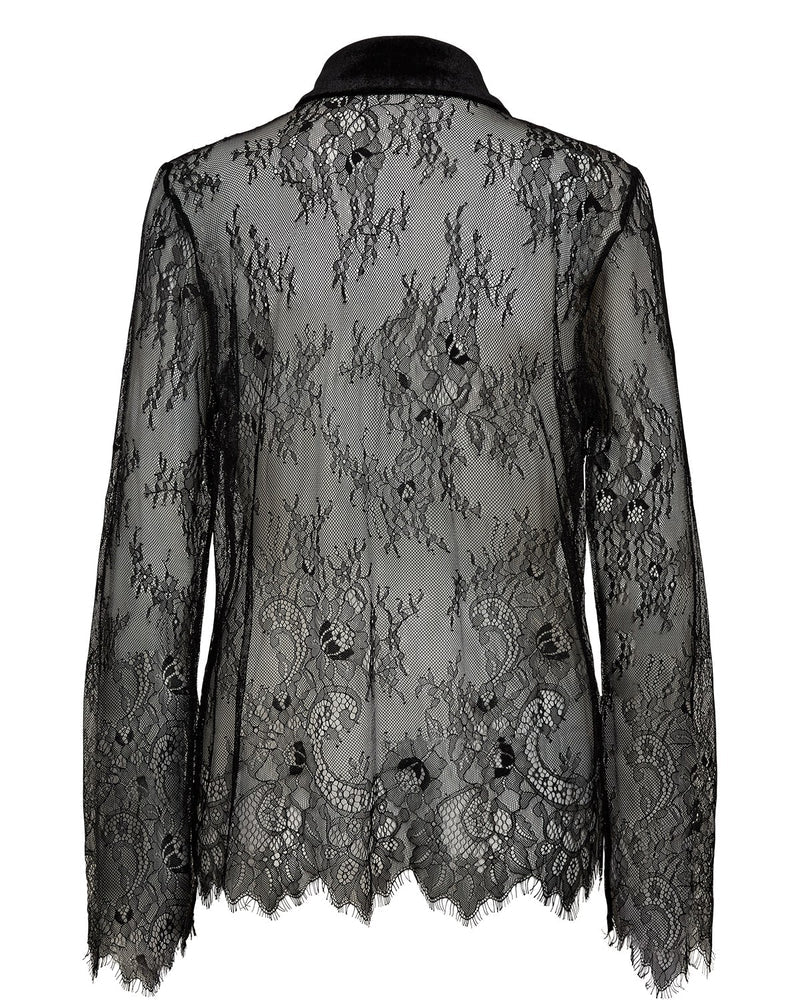 En elegant svart spetsblus med långa ärmar i transparent spets, en klassisk krage och knäppning framtill med sammetskant. Blusen är feminin och stilren, perfekt att bära till kostymbyxor, kjol eller jeans beroende på tillfälle. Den transparenta designen gör den också snygg att bära med ett linne eller topp under för en mer täckande look.