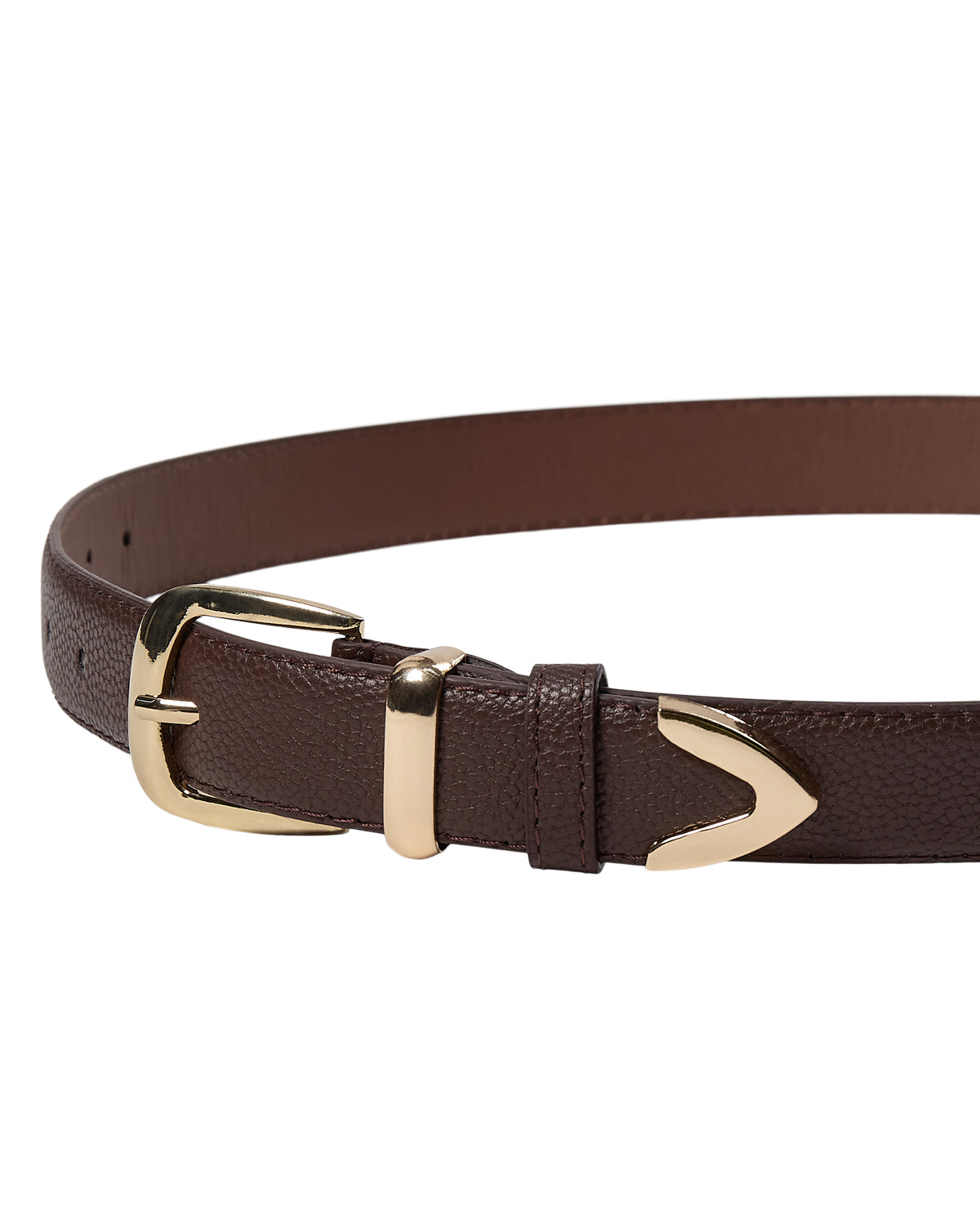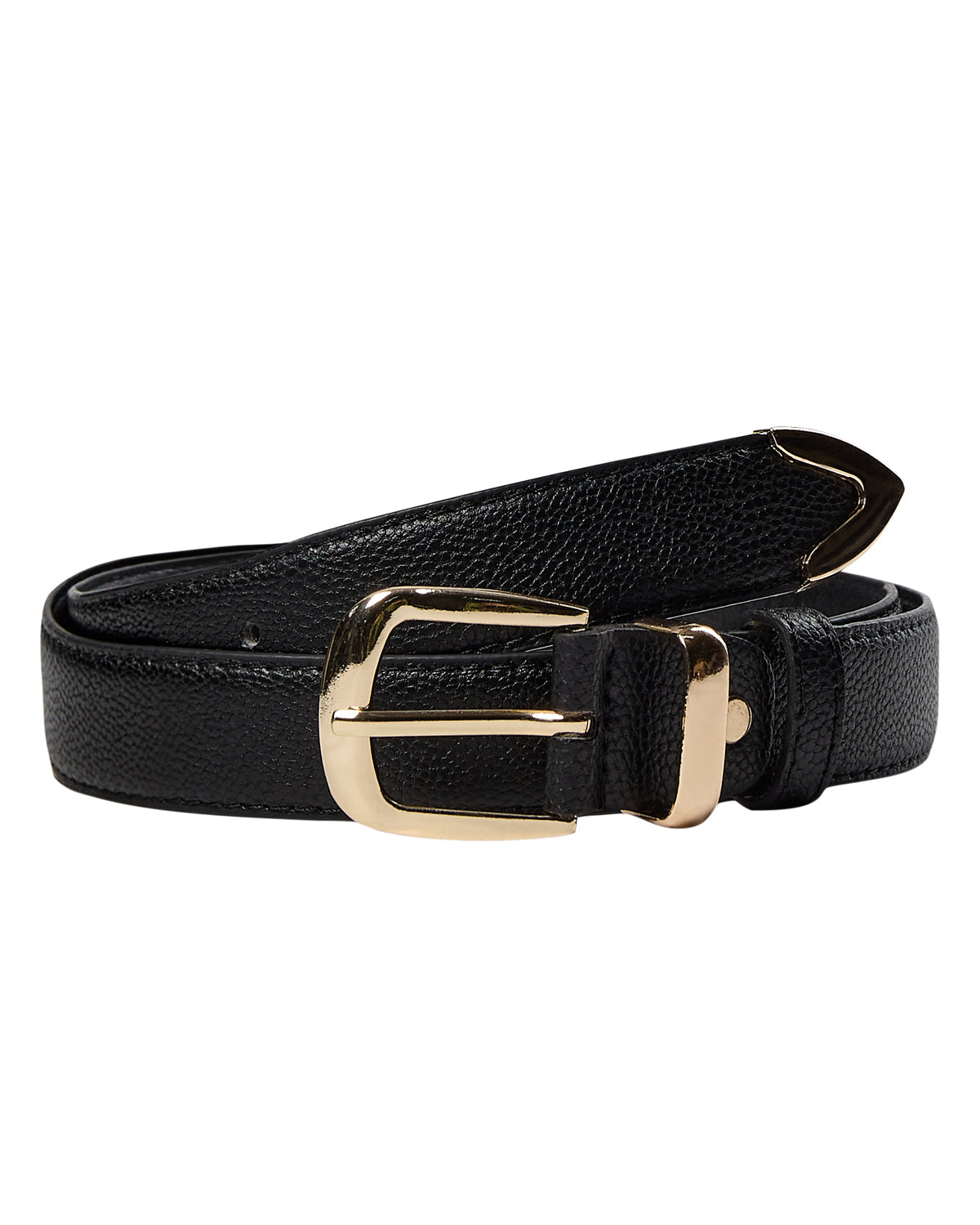 Nukarla är ett snyggt bälte med guldiga detaljer i fuskskinn. Finns i färgerna svart eller brunt.