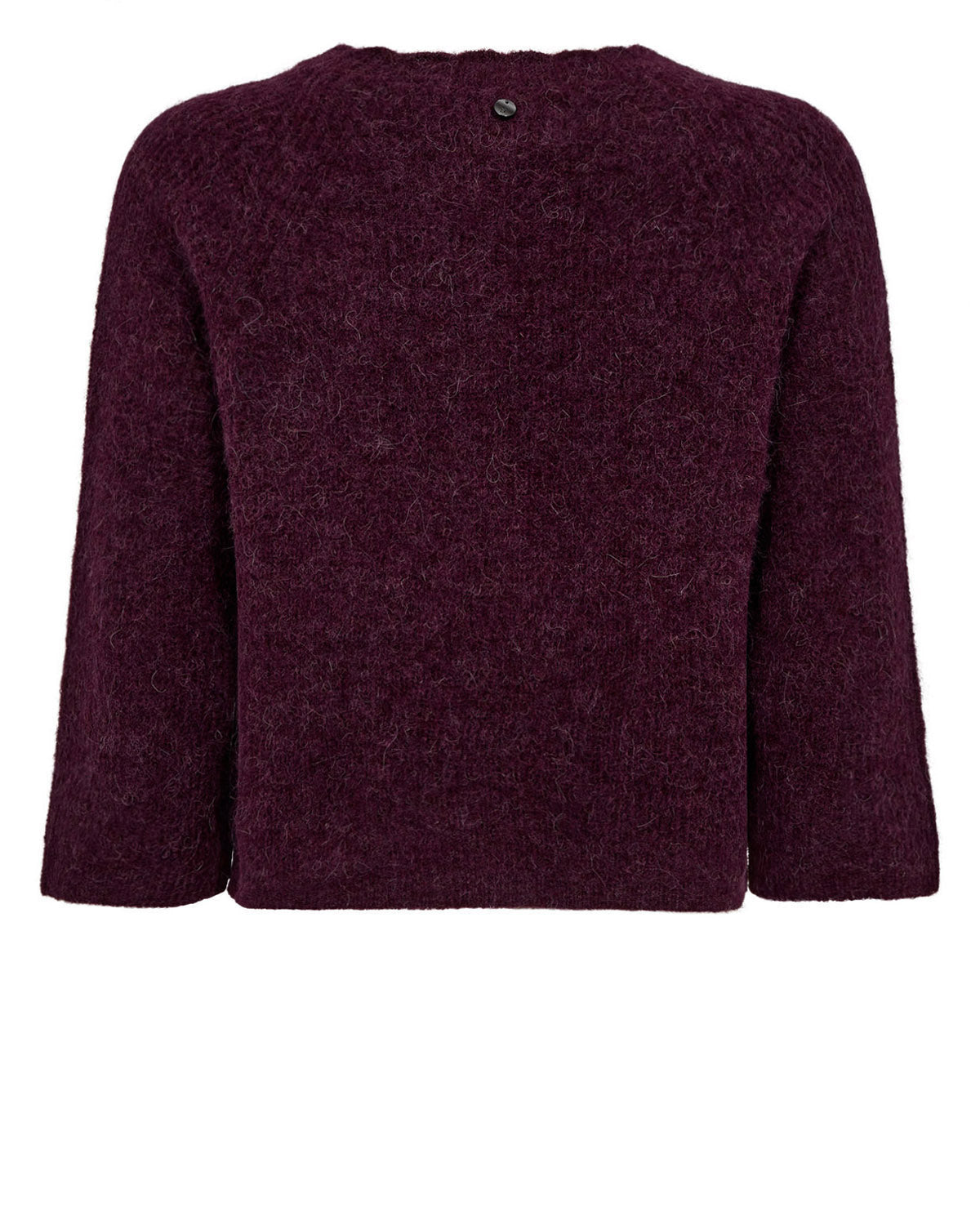 Nuriette är en favorit i repris från Nümph, denna gång i en supervin vinröd. Ärmarna är vida och till en längd strax nedanför armbågen. Ringningen är lätt böljad för en snygg effekt. Alpackan gör att den ser lite härligt fluffig ut.