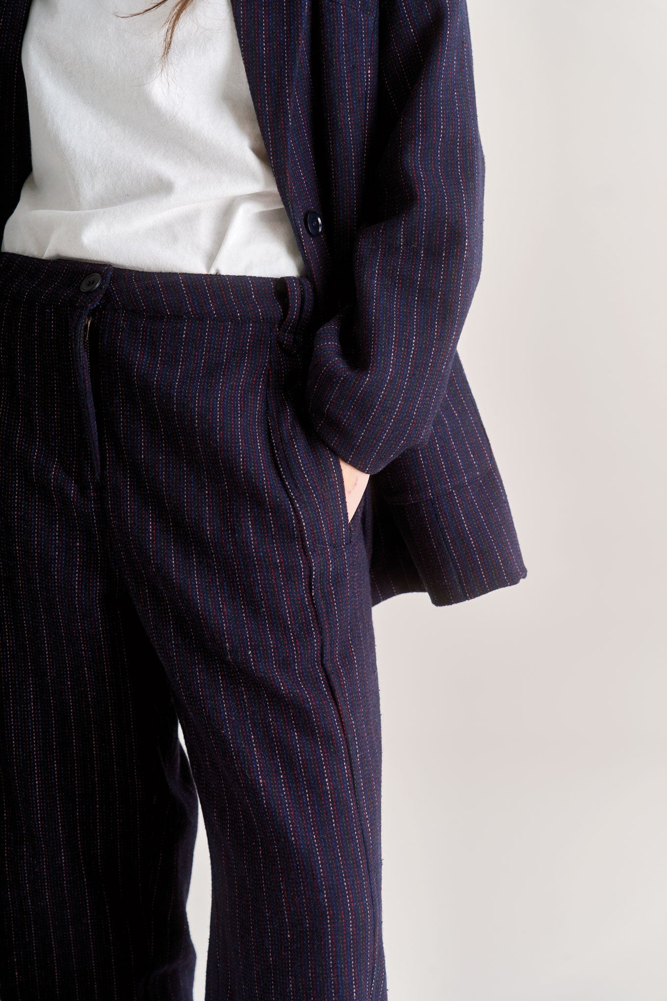 Maddie byxa från Komodo är en återvunnen Polyullbyxa i marinblått som kombinerar komfort och samvete. Tillverkade med 80 % återvunnen polyester och 20 % återvunnen ull, plus ett foder i 100 % ekologisk bomull, erbjuder dessa byxor en mjuk och hållbar känsla. Etiskt producerade i en SEDEX-granskad fabrik, har de corozo-knappar, en metalldragkedja och en medellåg midja med avsmalnande fållar. Paneldetaljerna och den löst sittande passformen ger en avslappnad stil till en längre längd, vilket gör MADDIE-byxorna till ett genomtänkt val för moderna garderober.