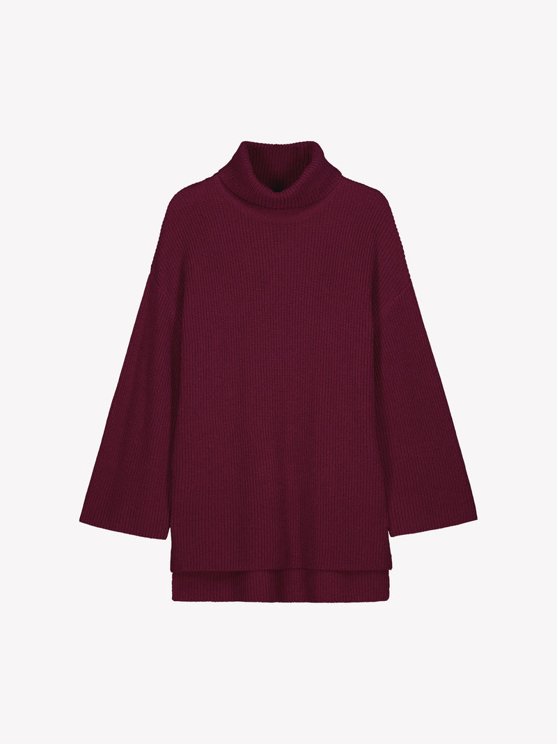 Denna fina tröja från Nanso i härlig vinröd färg har polokrage, nedsänkta axlar och vida hellånga ärmar. Fållen har slitsar i sidorna.